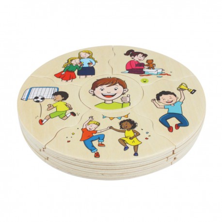 Joc educativ din lemn, ce contine 30 de piese cu tema emotiilor. Promovează educația socială și lingvistică și antrenează coordonarea ochi-mână.