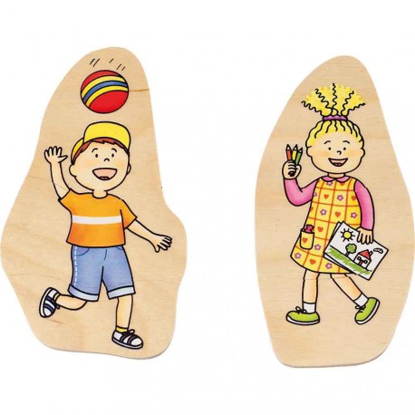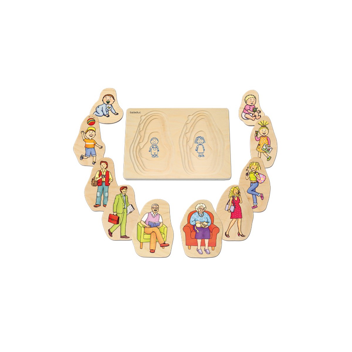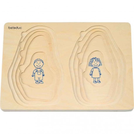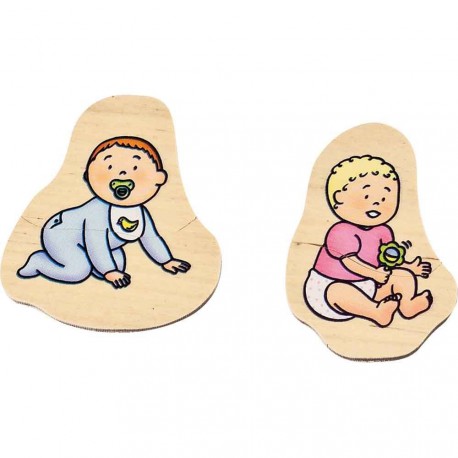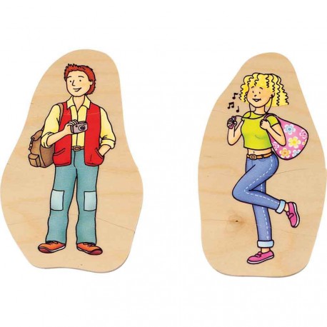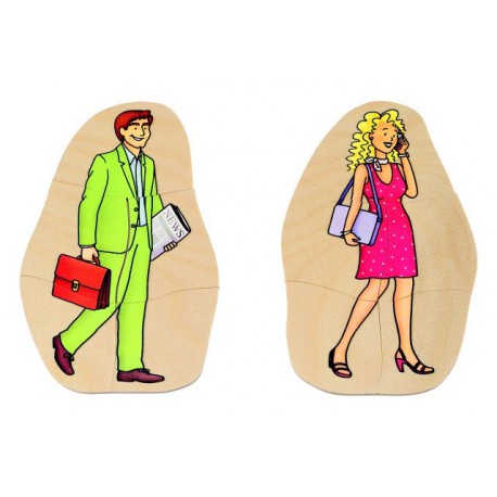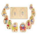 Puzzle stratificat din lemn compus din 40 de piese care alcatuiesc 10 imagini diferite ale varstelor femeii si barbatului: bebelus, copil, tanar, matur si varstnic.