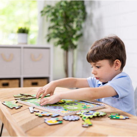 Asamblati impreuna 24 de piese de lemn pentru a crea o scena de animale colorate si un puzzle care se misca!